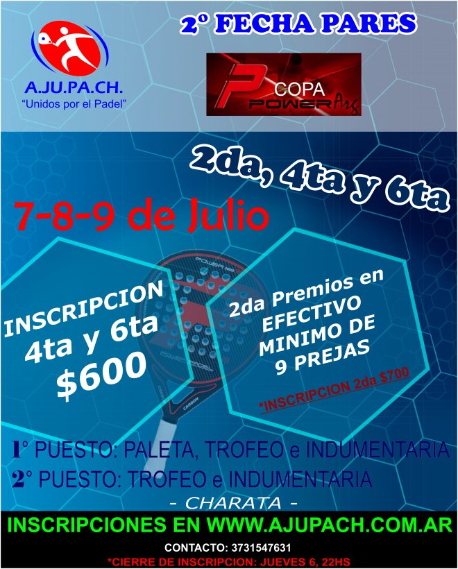 »» Evento: AJUPACH : 2DA FECHA PARES »» Localidad: Charata »» Fechas: 07/07/2017 al 16/07/2017