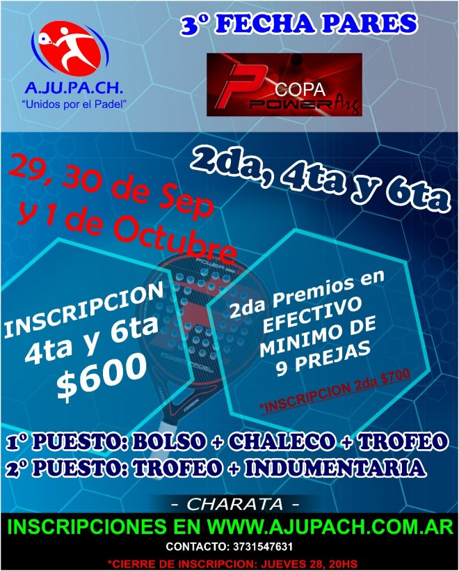 »» Evento: AJUPACH : 3RA FECHA PARES »» Localidad: Charata »» Fechas: 29/09/2017 al 01/10/2017