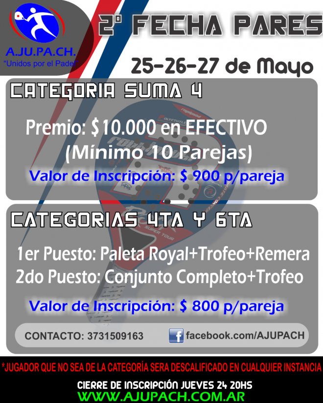 »» Evento: 2DA FECHA PAR »» Localidad: Charata »» Fechas: 25/05/2018 al 27/05/2018