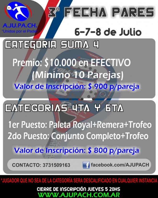 »» Evento: 3RA FECHA PAR »» Localidad: Charata »» Fechas: 06/07/2018 al 09/07/2018